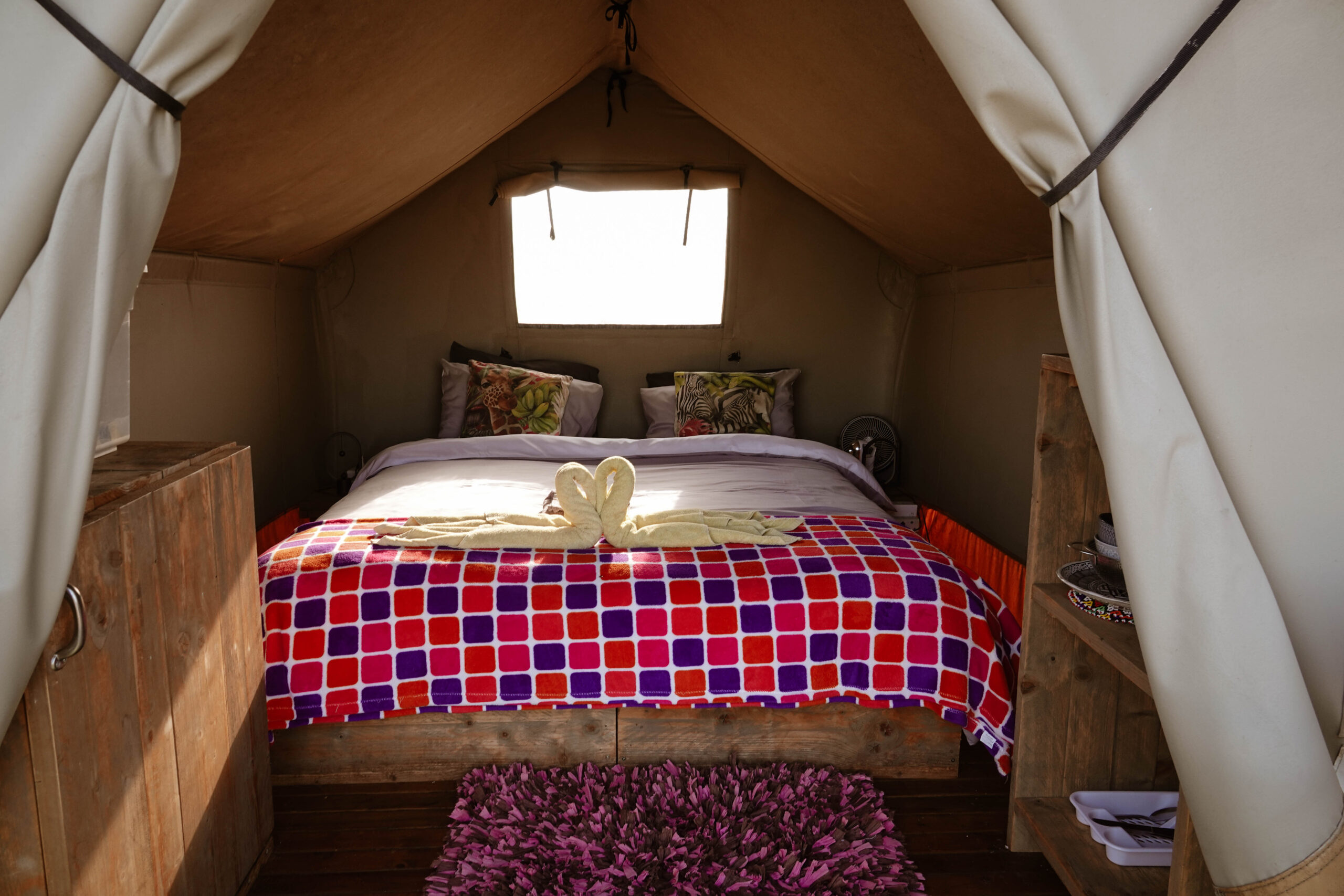 The tents are fully equipped with electricity, a small fridge, gas cooker, pots, pans, towels, sheets and their own outside bathroom with toilet. It’s a more luxurious way of camping.