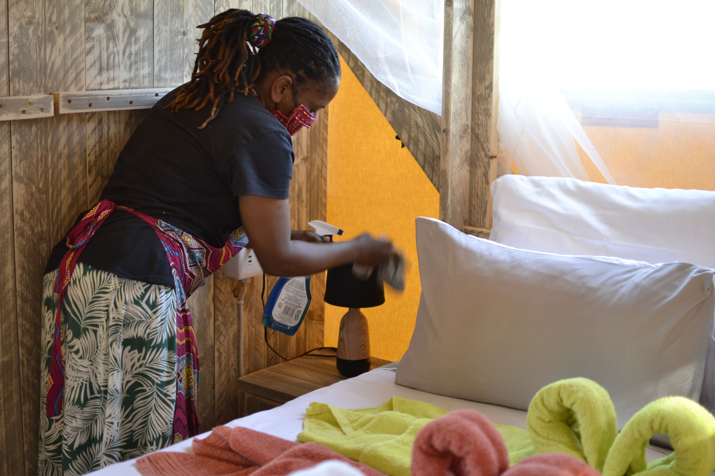 Our tents get cleaned by our well-trained staff with special disinfection products. We offer laundry service if requested. We stay out of your tent as much as possible, only if you desire otherwise. Towels and bedding will be washed at a high temperature.